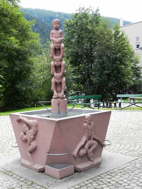 На этом прогулку по городу можно было считать законченной. Но Давос в целом произвёл на нас очень хорошее впечатление – уютный, нешумный, удачно спланированный, поэтому на стоянку мы не торопились и ещё немного поплутали по его улочкам, пристально оглядываясь по сторонам. Обратили внимание на росписи стен здания, в котором размещается Музей зимнего спорта. Несмотря на современную тематику, уж очень они похожи на довольно распространённые в Граубюндене сграффито.