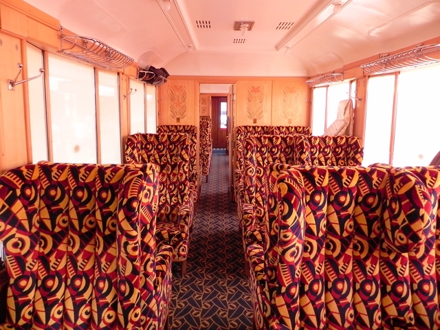 Воспользовавшись такой редкой удачей, я заскочил в один из вагонов, чтобы осмотреть его изнутри. В глаза бросилась деревянная отделка и настоящие мягкие кресла, обитые пёстрым велюром.
