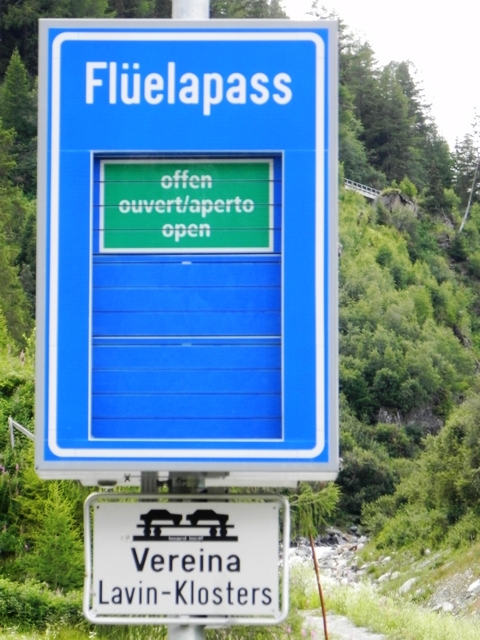 Я хотел сфотографировать щит, информирующий о том, что перевал Флюэла, с которого мы только что спустились, открыт для проезда. Снизу к щиту была прикреплена табличка, на которой изображена железнодорожная платформа для перевозки автомобилей и сделаны две надписи: Vereina и Lavin-Klosters.