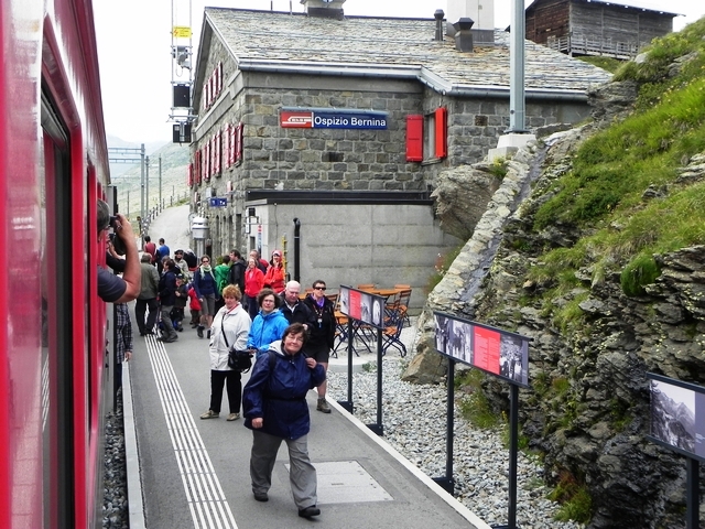 На станции Ospizio Bernina вагоны забили под завязку многочисленные любители горного треккинга, которые предпочли провести свой выходной день в походах. В том числе была замечена большая стайка детишек дошкольного возраста, которых с раннего детства приучают к здоровому образу жизни.