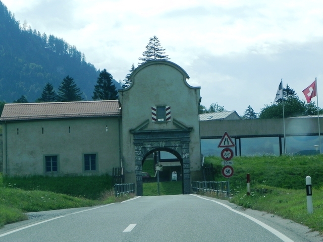 Здесь же начинается и территория горного кантона Граубюнден. Как бы в доказательство этого шоссе устремляется к нашему первому сегодняшнему перевалу — St. Luzisteig. Перевал невысокий, всего-то 713 метров, и процесс его преодоления память вряд ли бы зафиксировала. Но, достигнув вершины, невольно пришлось притормозить – дорога упёрлась в земляной вал, на котором возведены фортификационные сооружения. В ожидании какой-нибудь проверки несмело въезжаем на территорию форта через узкий портал.