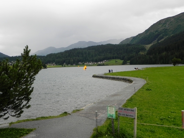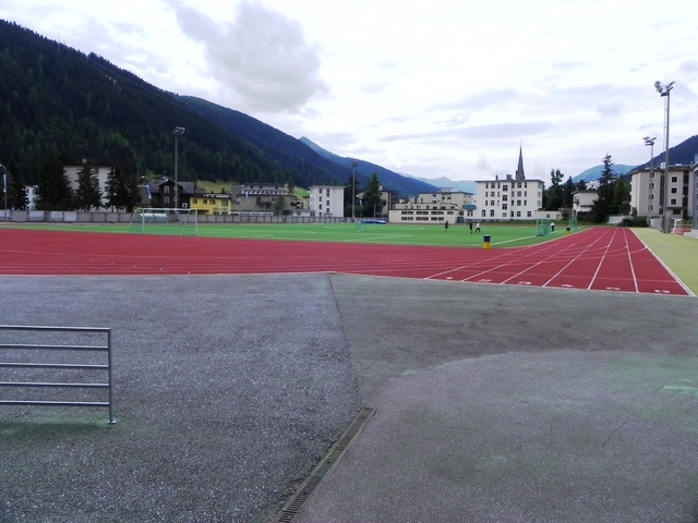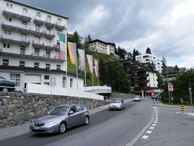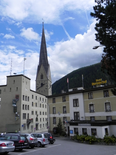 В известный во всём мире и как горнолыжный курорт, и как место проведения Всемирного экономического форума Давос (Davos) мы приехали в начале первого. Городок, зажатый с двух сторон горными цепями, вытянулся в длину параллельно реке Ландвассер. Из конца в конец Давос пронзают две улицы с односторонним движением. На Променаде, вдоль которой построены самые престижные отели и магазины, даже летом найти свободную парковку оказалось проблематично. Развернувшись, мы поехали, уже в обратную сторону, по улице Талштрассе. И здесь, в непосредственной близости от знаменитой ледовой Вейлант Арены, обнаружили огромный абсолютно пустой паркинг.