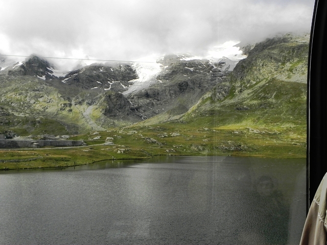 После остановки поезд медленно идёт вдоль кромки Лаго Бьянко. Мы успеваем заметить, что воды озера подпираются несколькими плотинами.