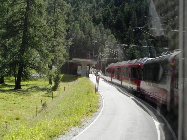 А вот и первая остановка – станция Понтрезина. К нам никто не подсел, так что мы с Машей единственные пассажиры, кто едет по-королевски – вдвоём на четырёх местах. Пока поезд стоит, наблюдаем, как в багажный вагон другого состава загружают чемоданы и велосипеды. Если бы у нас с собой был багаж, я бы, наверное, сошёл с ума, выбегая на каждой станции проверить, не пытается ли кто-нибудь уйти с нашими сумками.