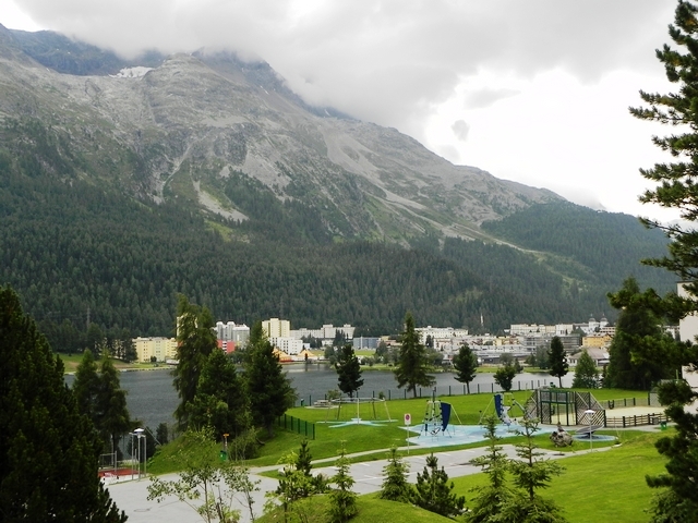Обустроившись, мы вернулись в город, чтобы посмотреть, в каких условиях отдыхают и развлекаются «сливки общества». Машину пристроили на паркинге возле восточной оконечности озера Лей да Сан Муреззан. Отсюда открывается хороший вид на верхнюю часть города – Санкт-Мориц Дорф.