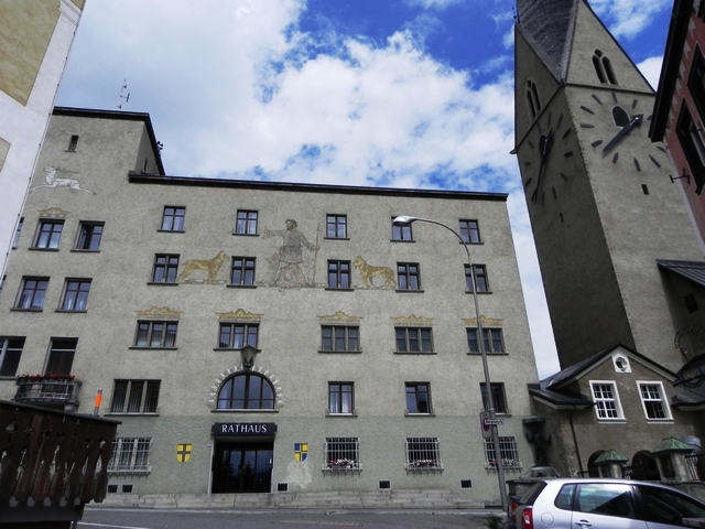 …здание ратуши, украшенное с фасада сдержанными фресками, а с торца – интересным деревянным декором.