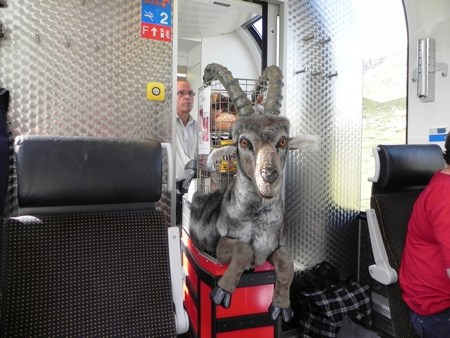 Итак, в 9.29 наш поезд покинул Санкт-Мориц. Пассажиры на какое-то время замерли в ожидании волнующих пейзажей. Но расслабиться им не дал стюард, который вкатил в вагон тележку-бар с напитками и сувенирами. Тележка была украшена чучелом альпийского козла. Эти животные частенько забредают в тот район, где проложена железнодорожная линия и являются символом «Бернинского экспресса».