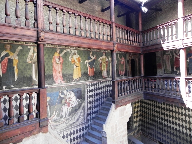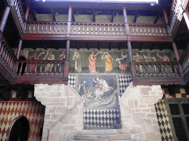 Войдя во внутренний двор, мы сразу же сталкиваемся с «визитной карточкой» замка – стены одной из опоясывающих галерей украшены фресками начала 15-го века. На них изображены мудрецы и древние философы, держащие в руках пергаменты с начертанными на них пословицами и изречениями.