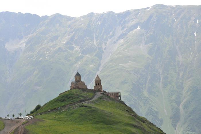 Вся Степанцминда живет этими достопримечательностями. Весь поселок ездит на Мицубиси Деликах. Ими же доставляет желающих на гору. Мы сами залезли на нашем Рекстоне.Пешим тоже можно добраться, но восхождение тяжелое. Красота неописуемая. Как оказалось, людишки мы «так себе»))), потому как Казбек показывает макушку, по местным преданиям, только очень хорошим людям. Эти места чудесно описал А.С. Пушкин (данные рифмы фигурируют во всех отчетах о посещении Гергети, вот и я не буду из «серой массы» выделяться))):