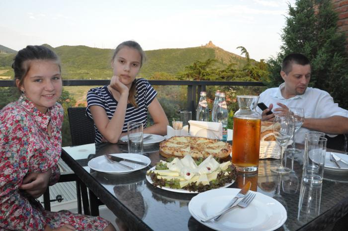Обедали в чудесном ресторане. С террасы этого заведения куда ни глянь умопомрачительные виды. В оду сторону посмотришь- монастырь Джвари (воспетый М.Ю. Лермонтовым), в другую сторону глянешь-Светицховели, в третью- крепость разрушенная. Цены, по сравнению с российскими- смешные на столько, что когда нам подали счет у нас наступил ступор, мы переглянулись, а официант испугался за нас))). В винном погребе потолок прозрачный и сквозь него видна стилизация под сельский винный погребок с глиняными емкостями под вино в полу-называются квеври. Мимо пройти невозможно-заведение на пересечении всех дорог))).