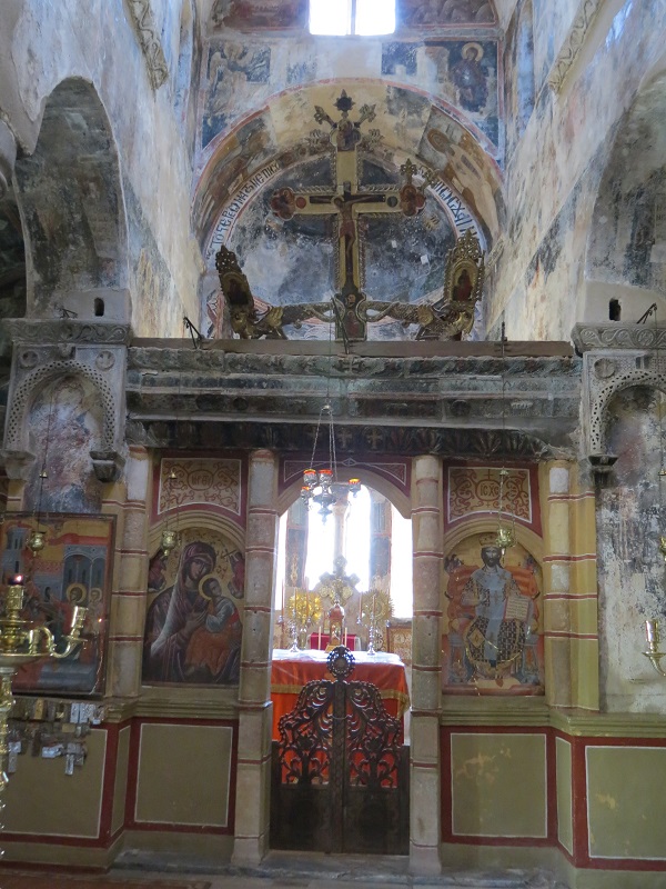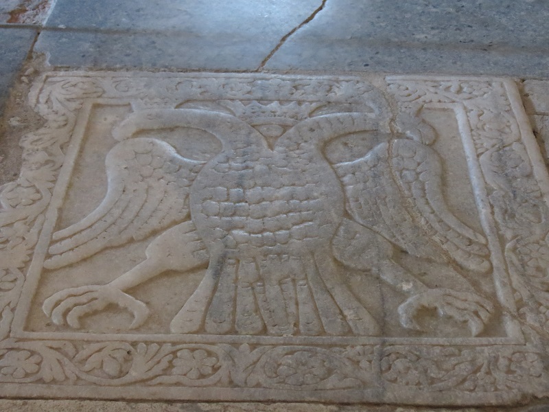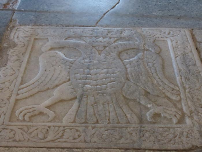 Внутри сохранились фрески XIV века, а на полу камень с изображением византийского двуглавого орла.