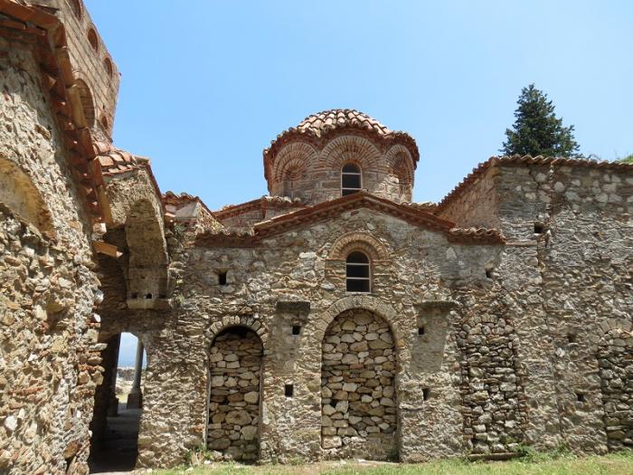 На автомобиле мы спустились к нижней части города. Кстати, сохраните входной билет, он приобретается один на обе части. Повернув направо от входа, очень скоро мы увидели Метрополию – собор XIV века, самую древнюю церковь в Мистрасе. Здесь в 1443 году был коронован последний византийский император Константин XI Палеолог.