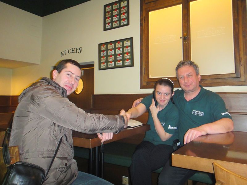 Но не могли мы уехать из Праги просто так. В Италии нас ждали друзья, которые очень хотели чешского пива, и, непременно, темного разливного. В пивной U Sedleru, куда мы пришли обедать отказать нам не смогли, но у них не оказалось бутылок. Но разве русского человека это остановит? Буквально в соседнем доме располагался супермаркет, в котором были куплены 4 полуторалитровые бутылки с водой, воду вылили, а пиво налили, закрепив сделку рукопожатием.
