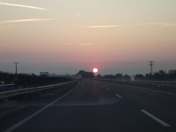 Утренний кофе, мы снова в пути. Восход солнца над автобаном в Венгрии.