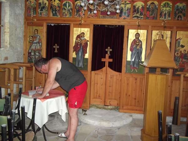 На полпути нам встретился небольшой храм, никакого жилья вблизи не было, но все было открыто. Мы, как православные, зашли внутрь, помолились, оставили запись в книге отзывов, кстати много отзывов было на русском.