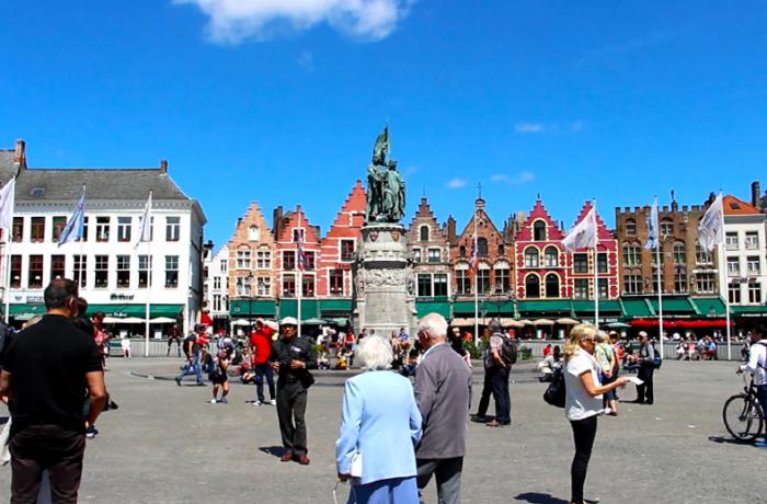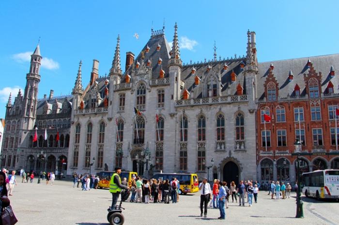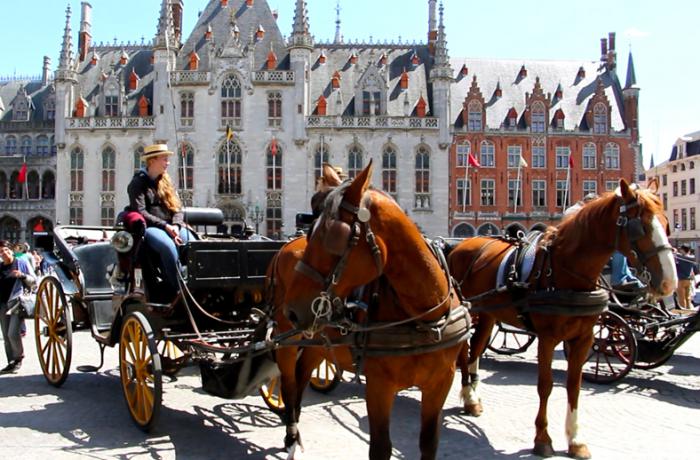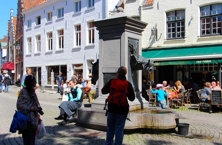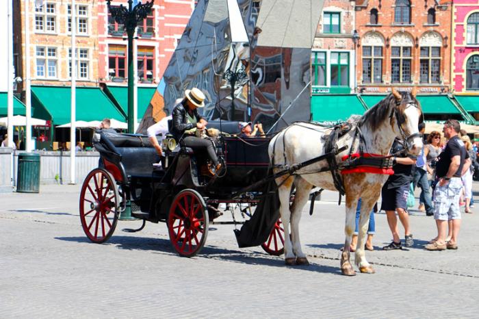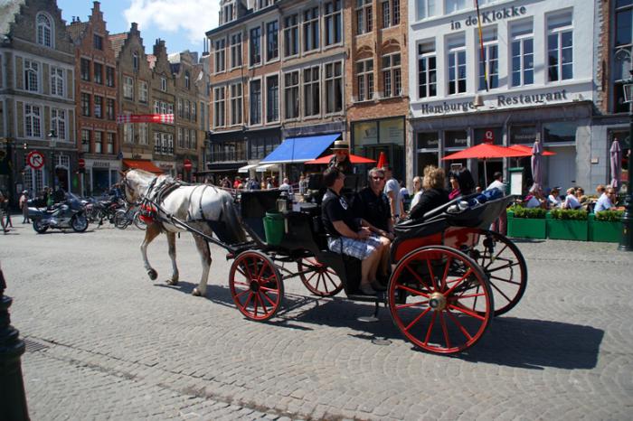 На площади уже вовсю «разгоралась» туристическая «тусня». Кто-то пешком, кто-то на «автопаровозиках», а кто-то на конных ретро-экипажах с кучерами в канотье, путешествовали по живописным улицам Брюгге, знакомясь с его примечательными картинками и погружаясь в эпоху прошлого.
