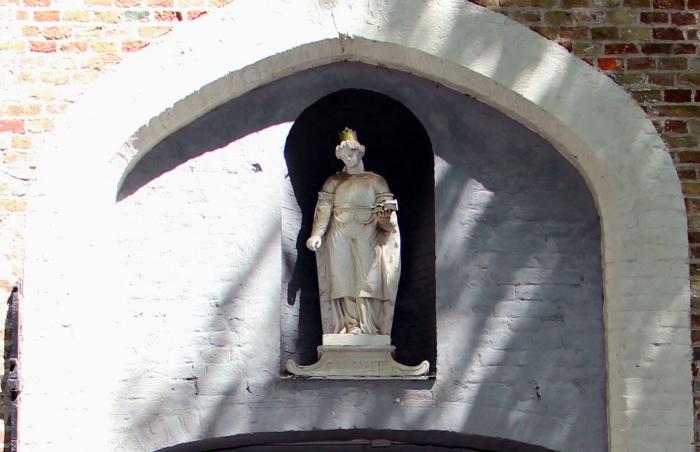 Мимо белых домиков по вымощенной тропинке мы вышли к церкви Святой Елизаветы, скульптура которой установлена над входом: