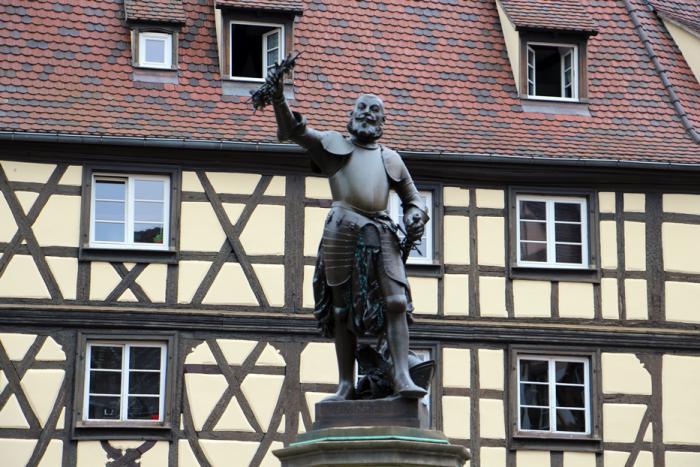 Изображённый на постаменте Жан (по некоторым данным Иоганн) Россельман, бывший в XIII городским прево, погиб, защищая родной Кольмар от войск епископа Страсбургского. В правой руке Россельмана свиток с надписью, гласящей «Libertas Civitatis Colmariensis» («Свобода городу Кольмару»):