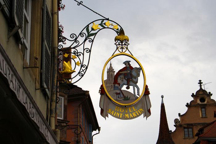 Вывеска отеля «Святой Мартин», где узнаваем шпиль башни Eglise Saint-Martin: