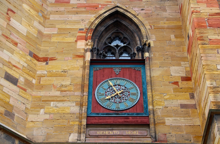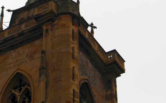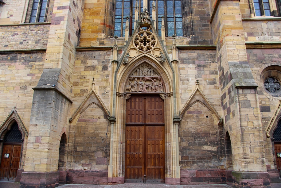 Если посмотреть на церковь с центрального фасада, то само строение напоминает массивную фигуру могучего животного (в моём случае — лев, исходя из цвета песчаника), опирающегося на мощные передние лапы, иллюзию которых создают контрфорсы с арочными проёмами по углам здания, взглянув через которые можно увидеть средневековый Кольмар: