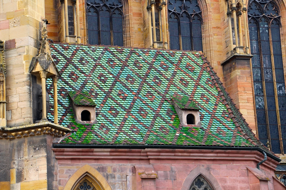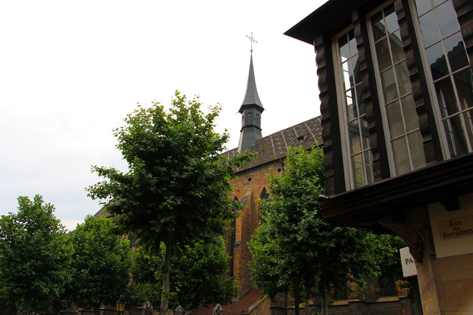 Чуть северо-западнее бывшего кафедрального собора, на площади Доминиканцев (Place des Dominicains), возвышается величественное готическое здание Доминиканской церкви (Eglise des Dominicains) – второй по величине в Кольмаре. К своему разочарованию я не обнаружил в наших фотографиях доминиканского шедевра, разве, что вот этот кусочек крыши с церковной башенкой…