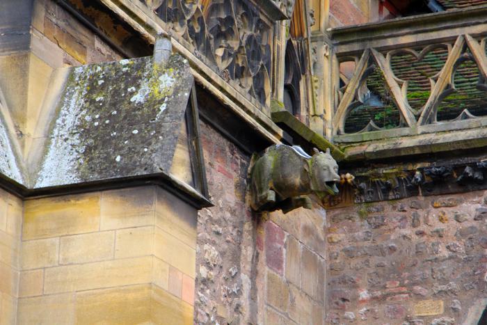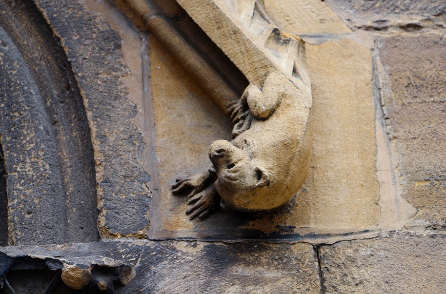 Обойдя церковь кругом осмотрели её, относительно скромное, наружное убранство. Как и положено готической церкви, местная не обошлась без гаргулий и химер:
