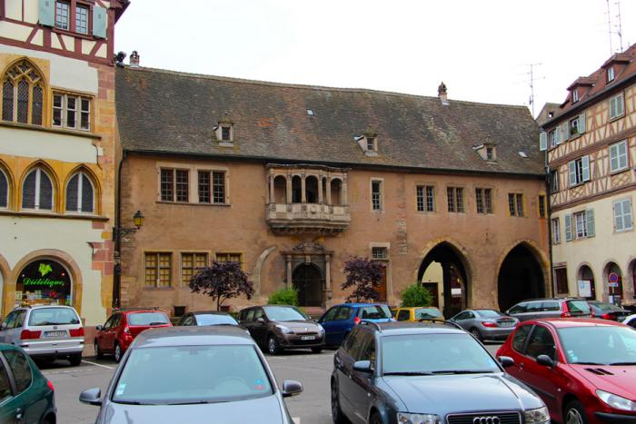 (maison Adolph в центре, слева — чуть более поздний (XV век) maison Gintzburger (дом Гинтцбургера), а справа — бывшая Кордегардия (Ancien corps de garde).