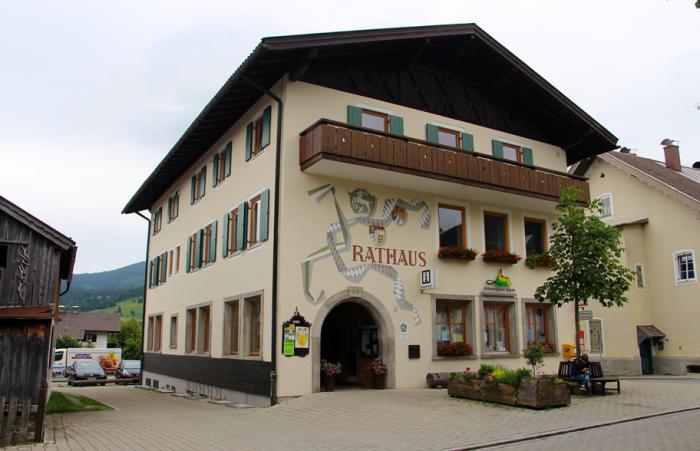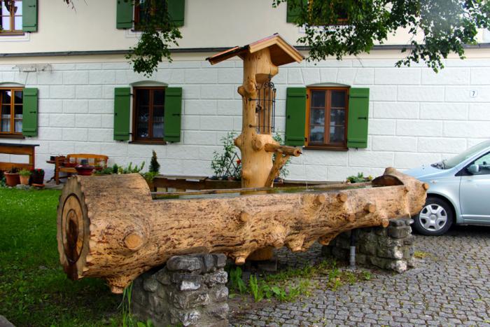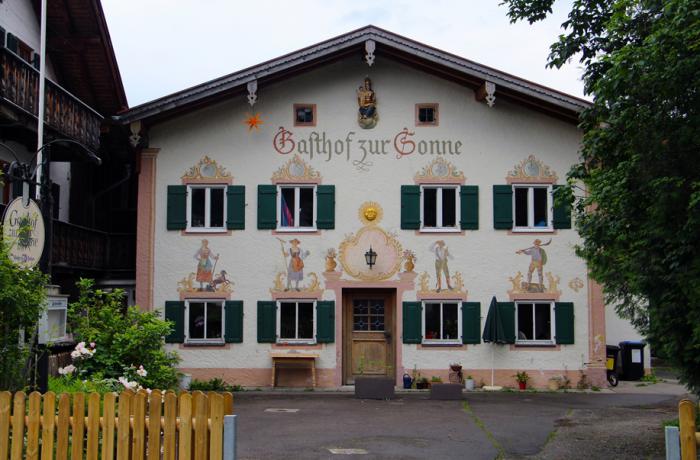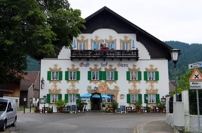 Через полчаса пути под непрекращающейся капелью мы достигли запланированного Унтераммергау. Перспектива прогулки по деревне с расписными домами, под нудным дождиком, нас не прельстила, и мы хотели проехать мимо, но дождик вдруг сник, а затем и вовсе прекратился. С судьбой не поспоришь. Географически «нижняя» соседка известной красочной Обераммергау оказалась не такой богатой на настенную роспись, но довольно уютной. Однако на удивление безлюдной: