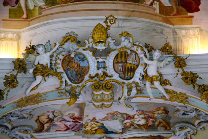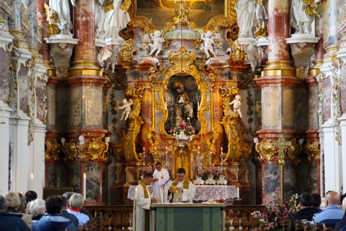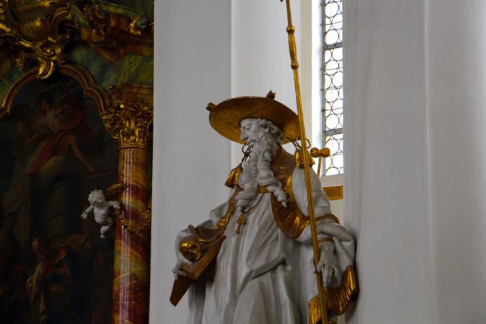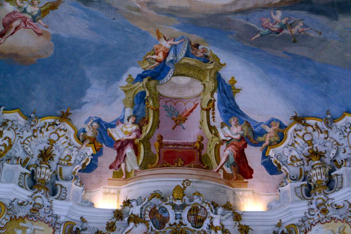 Под аккомпанемент мелкого дождика добежали от парковки до храма, и зашли внутрь. Скромная по наружному декору, Wieskirche богато декорирована внутри: убранная в стиле баварского рококо, с изящной лепниной и благородными фресками, церковь по праву считается одним из шедевров религиозной архитектуры Германии: