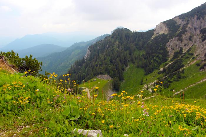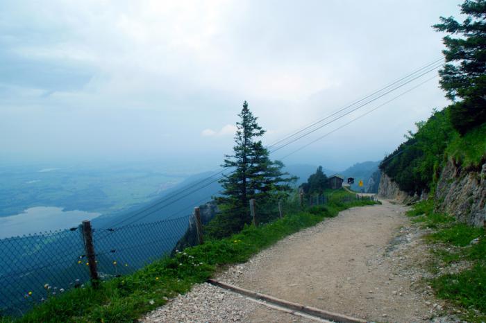 Когда спускались на парковку, заморосил мелкий дождик, понемногу усиливающийся, что грозило нам корректировкой дальнейших планов. Запланированный подъём на гору Тегельберг (Tegelberg), попал под угрозу срыва. Какой был смысл подниматься на почти 2-х километровую высоту, если всё вокруг затянет дождевая пелена?