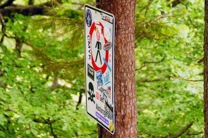 … то – предупреждающие таблички со следами «борьбы» с запретами, ограничивающими свободу передвижения, и оттого раздражающими особо любопытных, вроде нас: