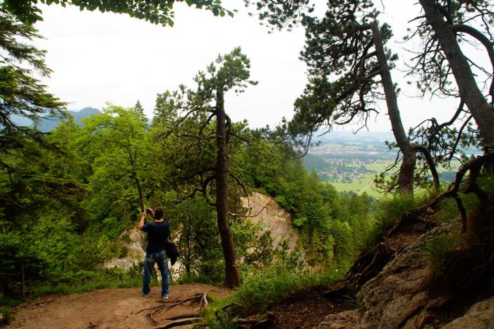 Оставив «дикое» покорение вершин до более благоприятных времён, мы спустились вниз и отправились к Нойшванштайну. Внутреннее посещение королевских замков мы не планировали, заранее избавив себя от ограничивающих временных рамок, и могли позволить себе бродить там, где вздумается. С изгиба дороги, по пути к замку, открывается красивейшая панорама лежащей внизу долины, посреди которой, словно на высоком троне, «восседает» на вершине замок Хоэншвангау (Hohenschwangau):