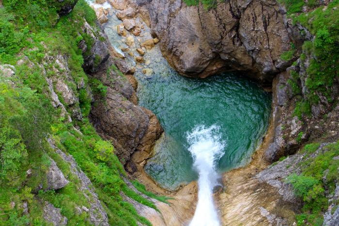 Узенький, слегка подрагивающий мостик, назван в честь матери Людвига II – королевы Марии. Взглянешь вниз – страшновато, более чем 90-метровая высота, а внизу — зажатая скалами река Пеллат и шум, низвергающегося с 45-метров, водопада: