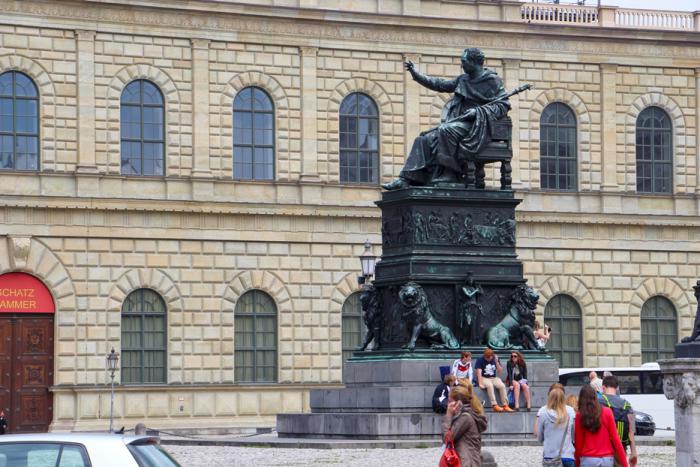 Посреди площади восседает на бронзовом троне бронзовый баварский монарх Максимилиан I: