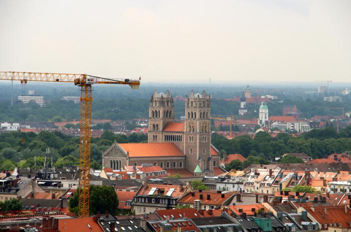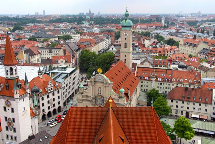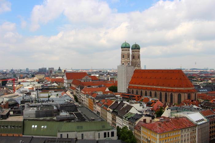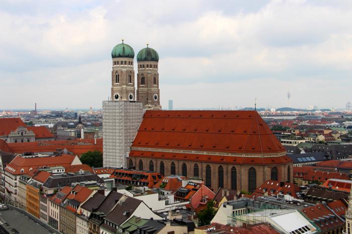 Колоритный Hirmer скрывает от нас громадину кафедрального собора Пресвятой Девы Марии – Frauenkirche, чьи запоминающиеся купола-«маковки» выглядывают поверх его крыши. Проходим чуть дальше по улице, сворачиваем налево в переулок и попадаем на Frauenplatz, на которой и доминирует главный мюнхенский храм. Чтобы разглядеть верхушки его башен головные уборы, если таковые имеются, придётся снять – высота колоколен составляет 99 метров. По первоначальному замыслу их верхушки должны были увенчать шпили, которые сюда как-бы и напрашиваются, но то-ли из-за нехватки средств, то-ли по причине изменения планов, были установлены нехарактерные для готики купола, ставшие со временем запоминающимся символом столицы Баварии. Собор является самым высоким городским строением, и в Мюнхене по сей день запрещено возводить здания выше Frauenkirche. Вместить собор в объектив фотоаппарата, находясь у его основания, занятие бесцельное. А вот с колокольни церкви Святого Петра получается очень даже неплохо: