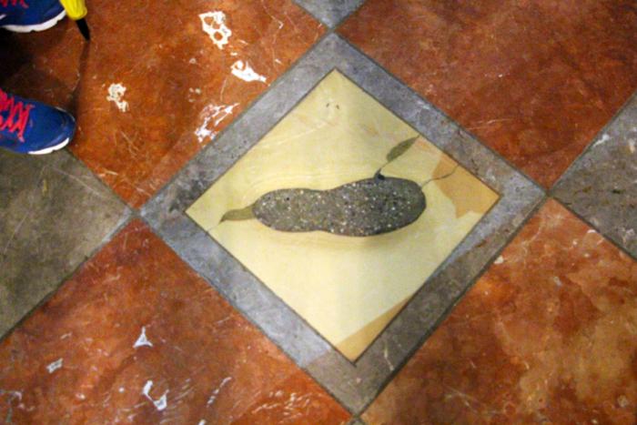 Могу засвидетельствовать — след внутри церкви присутствует, но это далеко не копыто, а хороший такой ботинок:
