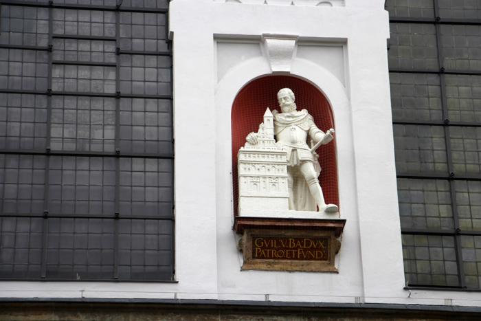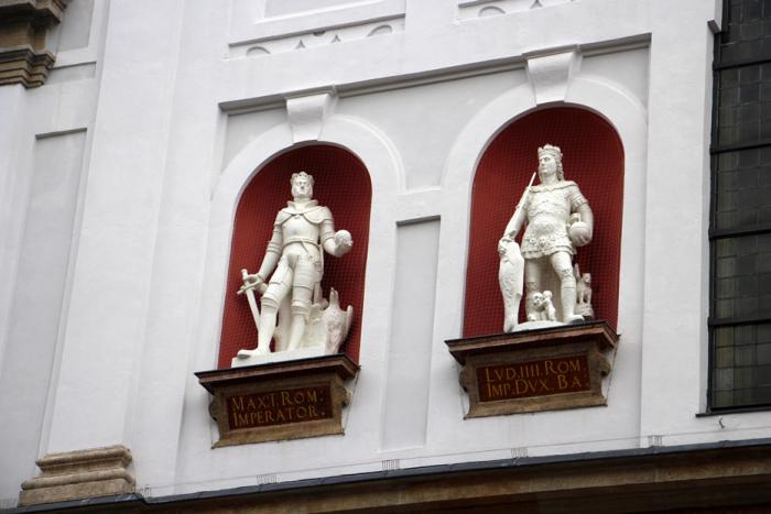 Её построили в конце XVI века. Белоснежный, разделённый строгими горизонталями на три яруса, ренессансный фасад, увенчанный треугольным фронтоном, украшен статуями представителей Виттельсбахской династии: