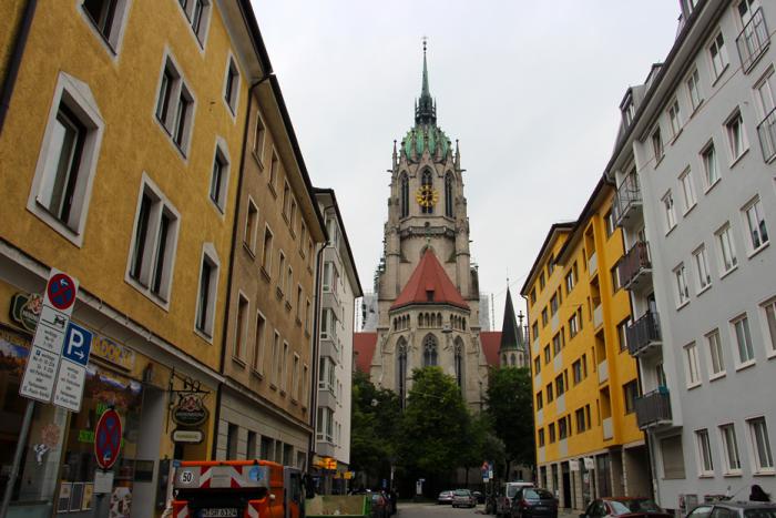 Преодолев чуть меньше сотни километров, разделяющие Этталь с баварской столицей, сопровождаемые уже непрекращающимся дождём, в пять часов пополудни мы припарковались у отеля на Landwehrstraße, 77, недалеко от церкви Святого Павла (Paulskirche):