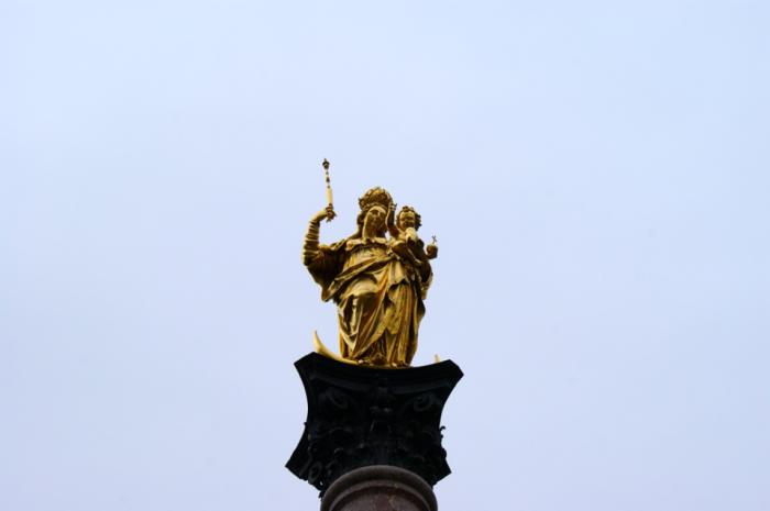 А затем мы вышли на Marienplatz – площадь, куда стекаются практически все людские потоки Мюнхена. Изначально она называлась Schrannen, но потом была переименована в честь Богоматери, так горожане хотели защитить себя от эпидемий, войн и других напастей. В центре площади установлена колонна, на 11-метровой высоте которой, сверкающая золотом статуя святой Марии, перенесённая сюда из Frauenkirche: