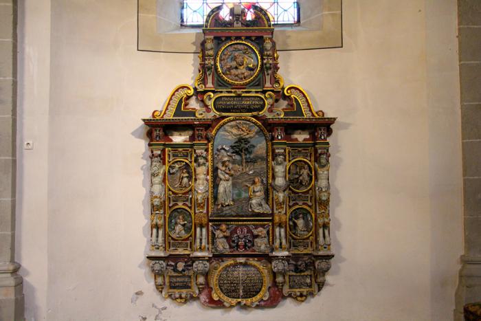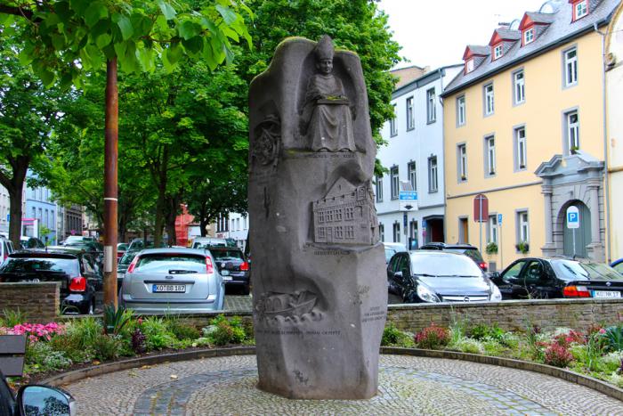В зелёном скверике, перед церковью, стоит памятник Николаю Кузанскому (в миру — Николасу Кребсу) — кардиналу, мыслителю, философу и много кому ещё, снисходительно взирающему на любопытных туристов с высоты постамента: