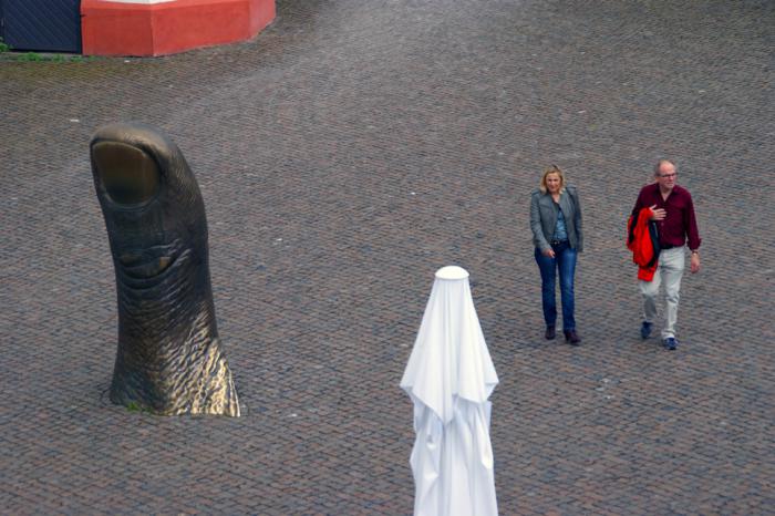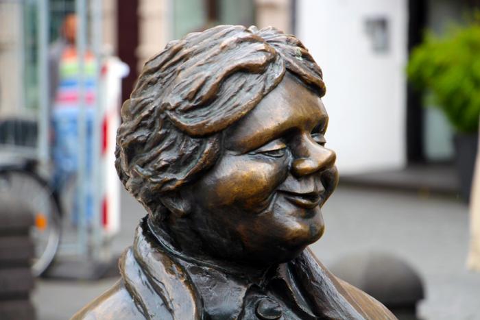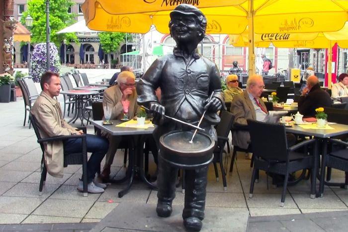 На первый взгляд можно подумать, что полицейский выписывает торговке штраф за торговлю в неположенном месте. Но это чисто российский подход к теме, на самом деле, как гласит присутствующая рядом табличка, законопослушная фрау жалуется Отто на то, что соседская собака опИсала брюки её супруга – херра Ринхельштайна, к сожалению, в композиции отсутствующего. Не знаю кому как, но добродушное лицо этой благовоспитанной фрау мне напомнило обаятельнейшую улыбку нашего любимого всесоюзного Винни-Пуха – Евгения Павловича Леонова: