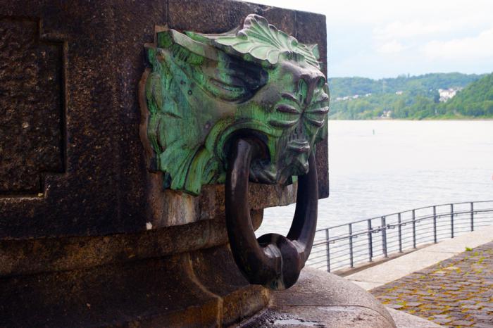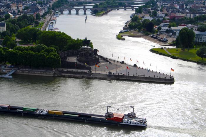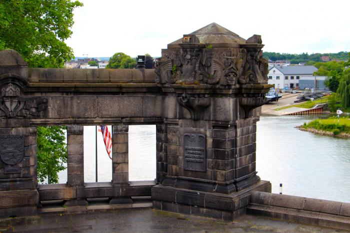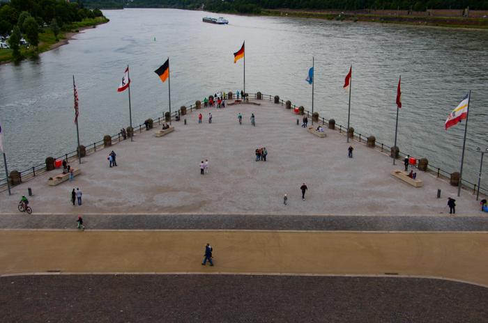 Кобленц известен в туристическом мире прежде всего своим Deutsches Eck (Немецкий угол) – местом слияния двух рек — Рейна и Мозеля. Именно эта главная городская примечательность вынесена на заглавную фотографию топика. Граница слияния отчётливо вырисовывается, благодаря различным оттенкам цвета воды обеих рек. Собственно говоря, и название города — Кобленц произошло от латинского сonfluentes – «сливающиеся». Приблизительно в 9 году до нашей эры, вездесущими в то время римлянами здесь был отстроен военный лагерь, названный «Castellum apud Confluentes», что переводится как «Укрепление у слияния рек». Так, что в случае с этим немецким городом, являющимся одним из украшений федеральной земли Рейнланд-Пфальц, разночтений в истоках названия, нет.