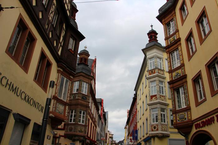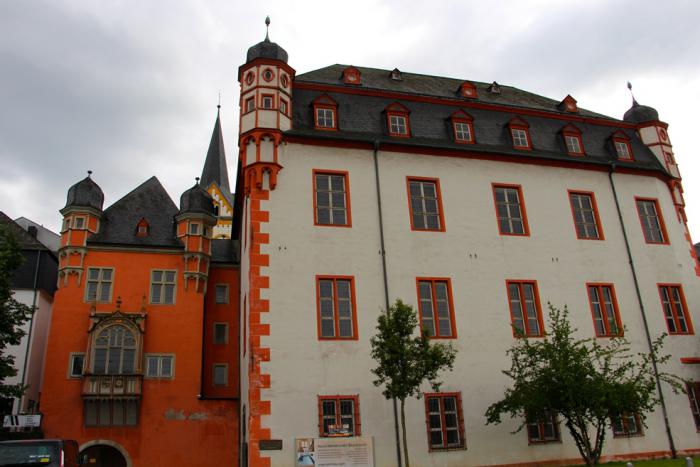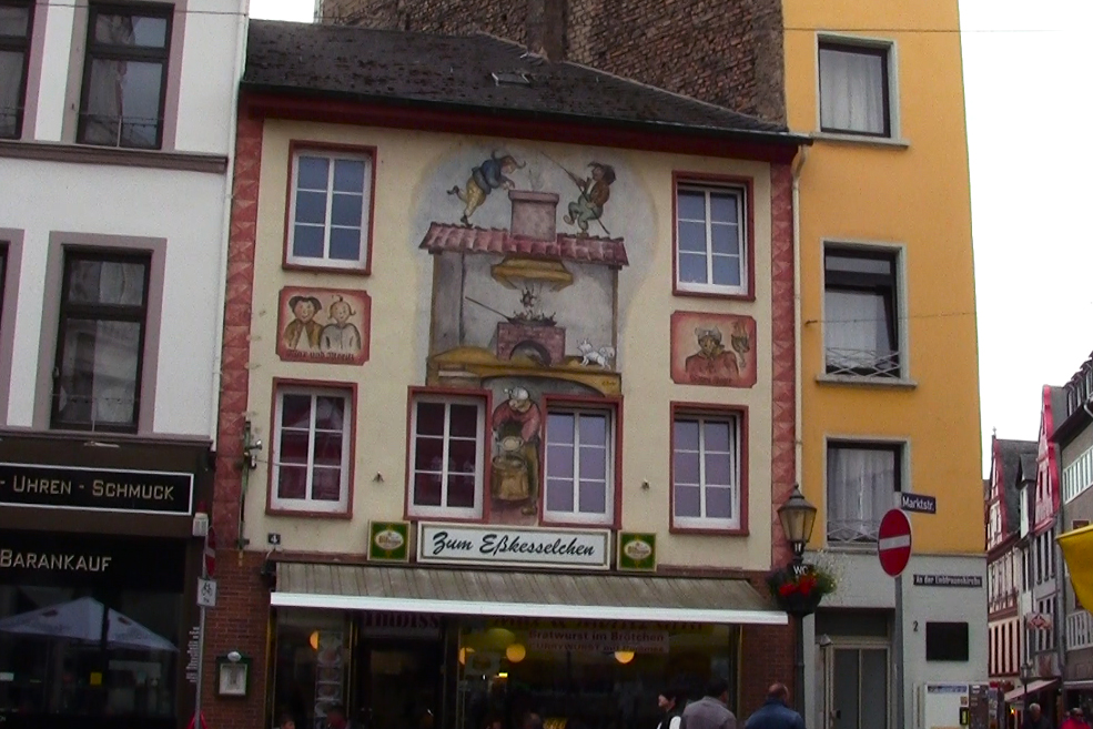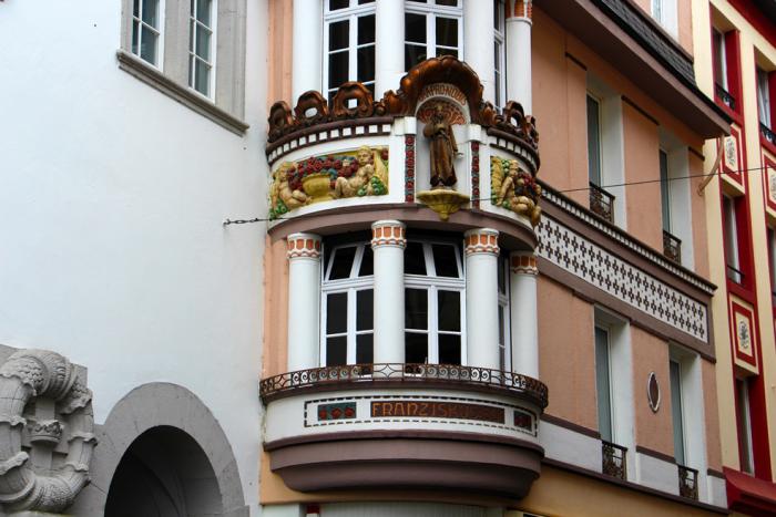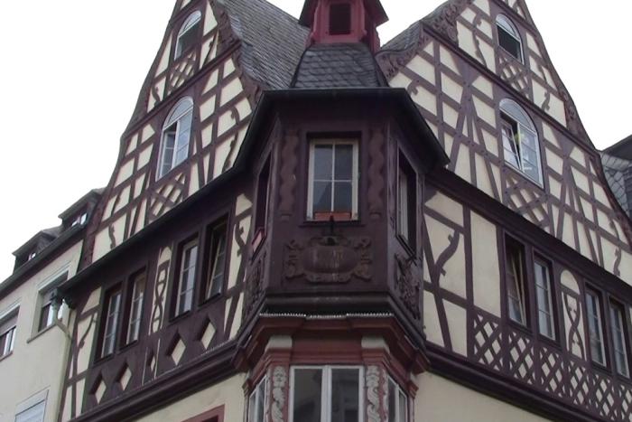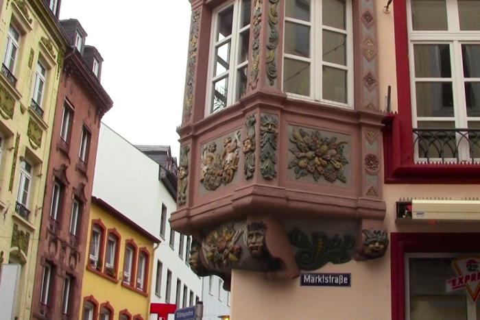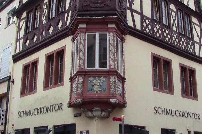 Примыкающее слева симпатичное красное здание с готическим балконом – ещё одна архитектурная достопримечательность Кобленца (XVI в.) – дом судебных заседателей шоффенов (Schоffenhaus). А как вам такой балкончик: