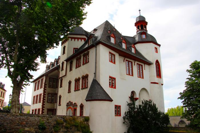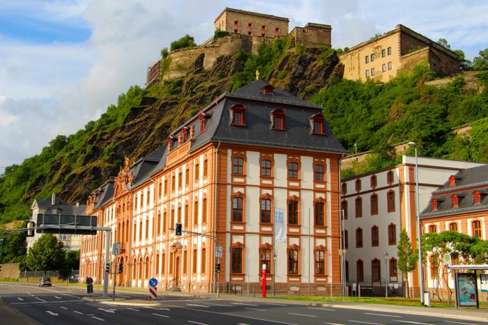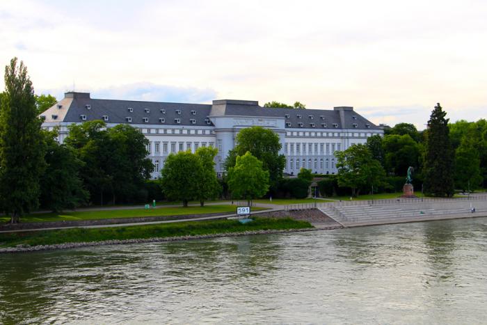 Однообразное, строгое здание, изначально строилось для архиепископа и курфюрста Венцеслава Саксонского, но прожил он там недолго из-за грянувшей Французской революции, и её отголосков, прокатившихся по Европе. С середины XIX века дворец стал резиденцией кайзера Вильгельма I, того самого, чей внушительный монумент украшает «Немецкий угол». Раскрашивают скучноватую цветовую гамму дворца газоны, клумбы и деревья прилегающего парка. Намного выигрышнее дворец выглядит со стороны Рейна: