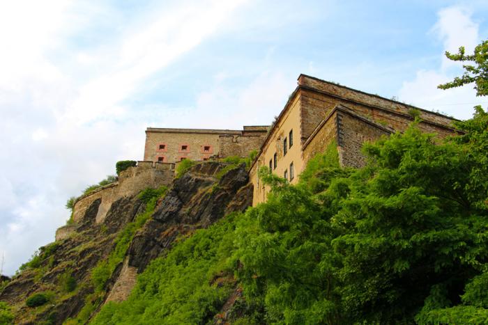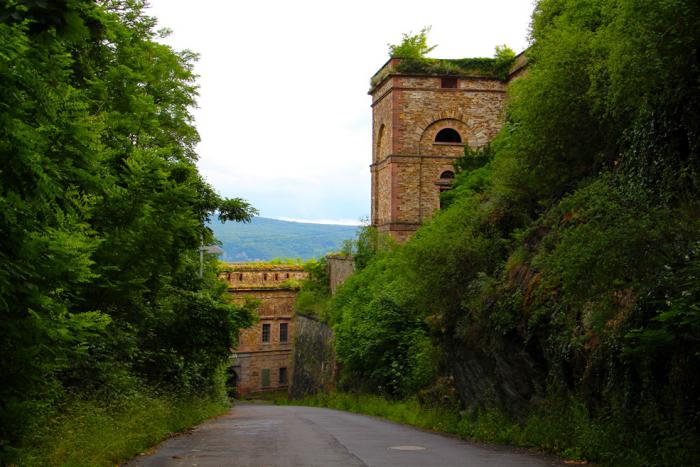 Даже Google Maps оказался бессилен против запертых дверей, но, как поётся в известной песне: «Кто весел, тот смеётся…» и далее по тексту. Изучив план крепости по той-же Google Maps, мы нашли-таки выход. Извилистая дорожка вниз, обозначенная на карте как Felsenweg, оказалась крайне безлюдной, из чего я сделал вывод, что мы в крепости были единственными «безлошадными» посетителями, ибо попутчиков у нас не нашлось. Если на дорогу от «Немецкого угла» до цитадели мы затратили каких-нибудь минут пять-семь, то обратно на западный берег мы возвращались примерно час, покрыв при этом километра четыре. Но в тот прекрасный вечер, погулять по замечательному городу было истинное удовольствие. Сначала мы в полном одиночестве (вот когда вспомнилась недавняя эпопея с поисками заветного WC) спустились по Felsenweg вниз, разглядывая Ehrenbreitstein с различных ракурсов: