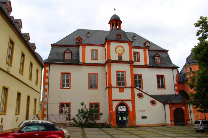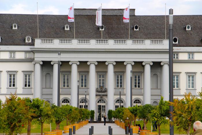 Вот теперь можно было вновь смело броситься в пучину любознательности. И поскольку, волею судьбы, мы оказались в исходной точке нашей экскурсии, теперь решили идти напрямик к набережной Рейна. Прямая, как стрела, Schlossstrasse вывела нас к дворцу курфюрстов, построенному во второй половине XVIII века в стиле французского классицизма: