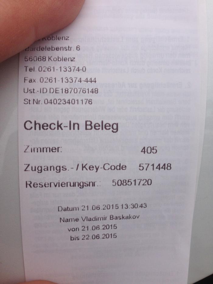«B&B Hotel Koblenz», где у нас был забронирован номер, располагается на пересечении улиц Moselring и Bardelebenstrasse. Название последней, произносимое на русском языке, нас с сыном от души повеселило, оставалось надеяться, что к нашему отелю это весёленькое название отношения не имеет. :) Припарковав машину возле отеля, мы пошли размещаться. Каково было наше удивление, когда внутри мы не встретили никого из персонала, да что там персонала – вообще никого – пустые коридоры, запертые двери номеров и ресепшн. Побродив минут пять по этим коридорным лабиринтам мы наткнулись на приехавшую перед нами немецкую пожилую пару, которая тоже была в недоумении: «А где народ?!»