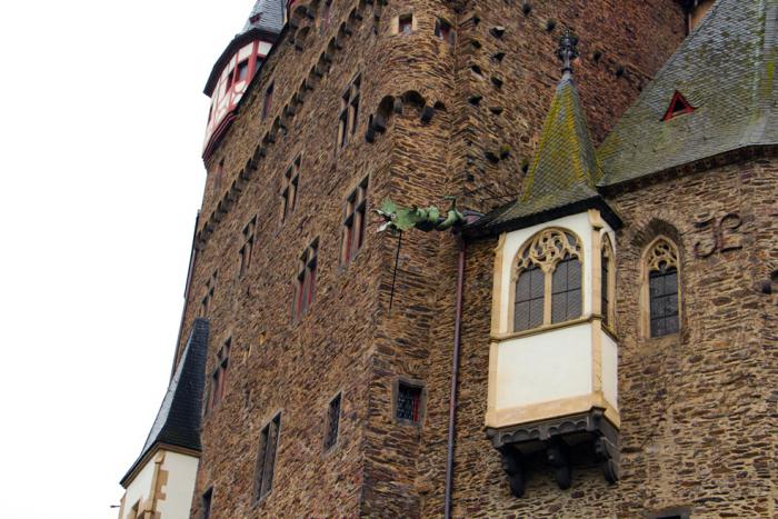 Внешний вид замка примечателен своей архитектурой, сплотившей в себе отзвуки различных эпох. Объясняется это просто, как в сказках: «Было у отца три сына…», здесь ситуация схожая – три наследника рода Эльц, после смерти родителя, получили в наследство помимо всего прочего и замок, который был поделен между ними поровну. И каждый из них и его потомков, впоследствии, достраивал и улучшал полученную треть на свой, как говорится, вкус и цвет: