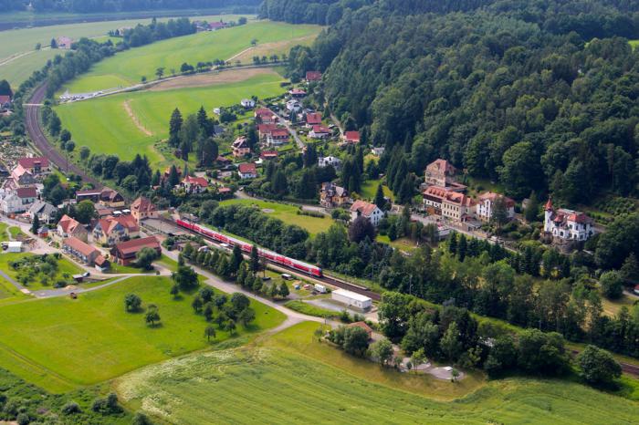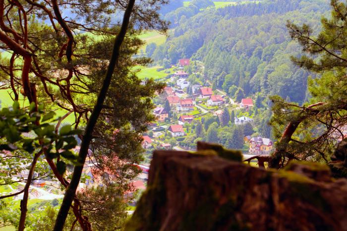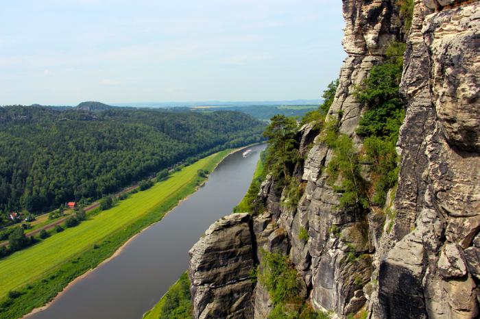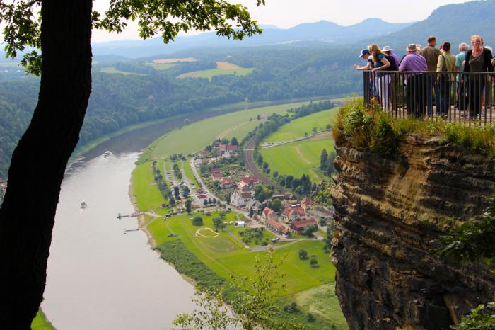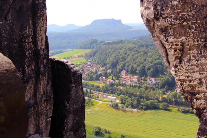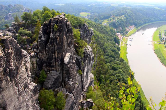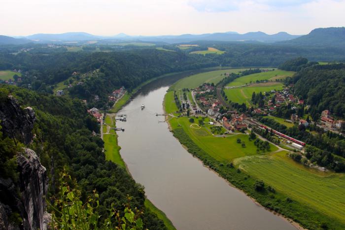 26 июня в 03:30, после короткого прощания, мы покинули «Рёмик». Около 650-ти километров по незагруженным автобанам проскочили чуть больше, чем за шесть часов. Около десяти утра «Аркаша» занял временную диспозицию на парковке на Basteistraße с координатами 50°57'54.5«N 14°04'00.9»E. От стоянки до парка Basteigebiet немногим больше 500 метров, которые мы прошли по совершенно равнинному ландшафту, и вдруг — бац… оказались в плену грандиозных и восхитительных панорам, открывающихся со стен природного бастиона, возвышающегося над красавицей Эльбой и курортным городком Ратен (Rathen), расположившемся на её берегах: