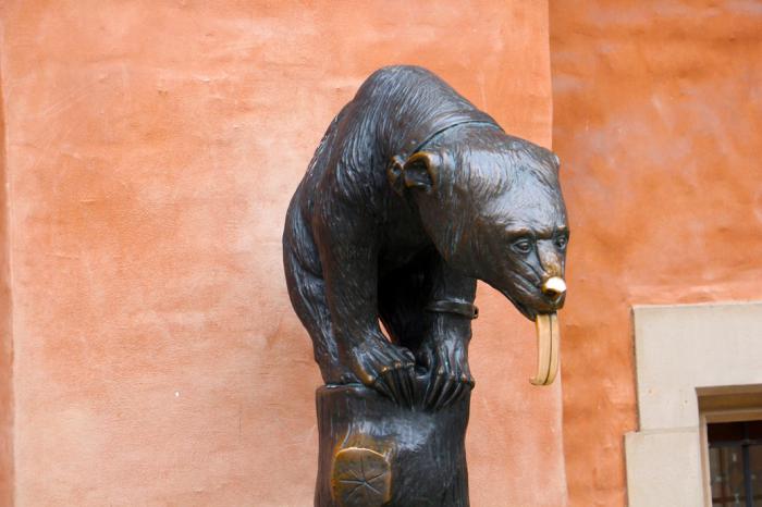 Она считается самой старой пивной не только в Польше, но и во всей Европе, ей уже более 700 лет. Но нас не прельстило закрытое помещение (наверняка — зря), хотелось посидеть на свежем воздухе. А вот изучить окружающую обстановку не отказались. Слева от входа стоит бронзовый медведь с высунутым, и отполированным до блеска, языком: